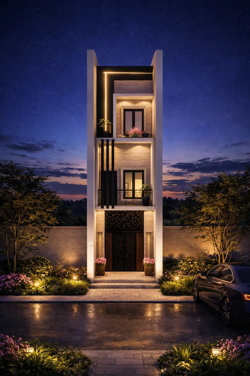 This project showcases a beautifully crafted 15 feet front elevation design created for our valued client Shehzada, designed by Naqsha Wala. The design is a perfect example of how modern architecture can transform a narrow frontage into a visually striking and elegant facade. In cities like Gujranwala, Lahore, and Islamabad, where plot widths are often limited, achieving both functionality and aesthetics in elevation design is a challenge—one that this project successfully overcomes. Concept & Design Vision The primary goal of this project was to create a modern, luxurious, and visually balanced elevation within a compact 15-foot frontage. The design focuses on vertical expansion, clean geometry, and strategic lighting to enhance the perception of height and openness. Instead of overcrowding the facade with excessive elements, the design adopts a minimalist yet bold approach, using strong vertical lines and layered textures. The elevation reflects a contemporary architectural style that appeals to modern homeowners looking for elegance and uniqueness. Architectural Features of the Elevation One of the most striking aspects of this elevation is its vertical framing structure, which visually elongates the building. The tall side walls create a sense of grandeur and make the house appear taller than its actual height. The facade includes: A double-height vertical frame with integrated LED lighting A balanced balcony design on upper floors Stylish black vertical fins that add depth and contrast A decorative entrance gate with intricate patterns The central alignment of doors and windows creates symmetry, while the combination of open and closed elements ensures both privacy and openness. Lighting & Night View Impact Lighting plays a crucial role in this design. The elevation is specifically enhanced for nighttime aesthetics, making the house stand out even after sunset. Key lighting features include: Warm LED strip lighting outlining the vertical frame Soft wall washers highlighting textures Landscape lighting in the front garden Entrance lighting that enhances the main gate area The result is a premium nighttime elevation look, giving the house a luxurious and welcoming appearance. Material Selection & Finishing The materials used in this design are carefully selected to balance durability and visual appeal. The elevation combines: Textured wall finishes for depth Neutral tones like beige and off-white Black accents for contrast Wooden textures at the entrance for warmth This combination ensures the facade remains timeless and does not go out of style quickly. Landscaping & Front Area Design Even with a limited front space, the design incorporates beautiful landscaping elements: Small planters with flowering plants Symmetrical greenery on both sides Soft ground lighting A clean paved walkway leading to the entrance These elements enhance curb appeal and create a welcoming environment. Ideal for Narrow Plots in Pakistan This 15 feet front elevation is ideal for: 3 Marla and 5 Marla houses Narrow plots in urban areas Housing societies like DHA, Bahria Town, and City Housing It proves that even with limited width, a house can have a premium and modern appearance. Why Choose Naqsha Wala At Naqsha Wala, we specialize in creating customized architectural solutions that meet both functional and aesthetic needs. Whether you are building in Gujranwala, Rawalpindi, or Lahore, our designs are tailored to local requirements and modern trends. We focus on: Client-specific customization Modern and practical designs Cost-effective solutions High-quality presentation and detailing This project for Shehzada is another example of our commitment to excellence in architectural design. Tags (Comma Separated Without Spaces, With Dash) 15-feet-elevation,modern-house-front,naqsha-wala-design,narrow-house-elevation,house-facade-design,pakistan-architecture,modern-elevation,small-plot-design,front-elevation-ideas,architect-gujranwala Pinterest Description (500 Words) This stunning 15 feet front elevation design by Naqsha Wala is a perfect example of modern architecture tailored for narrow plots in Pakistan. Designed for client Shehzada, this facade showcases a clean, vertical layout that enhances the building’s height and visual appeal. The design features a bold rectangular frame highlighted with warm LED lighting, creating a luxurious nighttime effect. The combination of textures, including smooth plaster, stone finish, and wooden accents, adds depth and sophistication to the elevation. The balcony design is simple yet elegant, with modern railings and integrated greenery that softens the overall look. Vertical black fins add contrast and create a striking architectural statement. The entrance is designed to be welcoming, with decorative elements and soft lighting that enhances the overall ambiance. Small landscape features, including plants and ground lights, add charm and improve curb appeal. This elevation is ideal for homeowners looking to build a stylish house on a narrow plot without compromising on aesthetics. It is especially suitable for 3 Marla and 5 Marla homes in urban housing societies. If you are looking for modern house elevation ideas in Pakistan, this design by Naqsha Wala is a perfect inspiration.