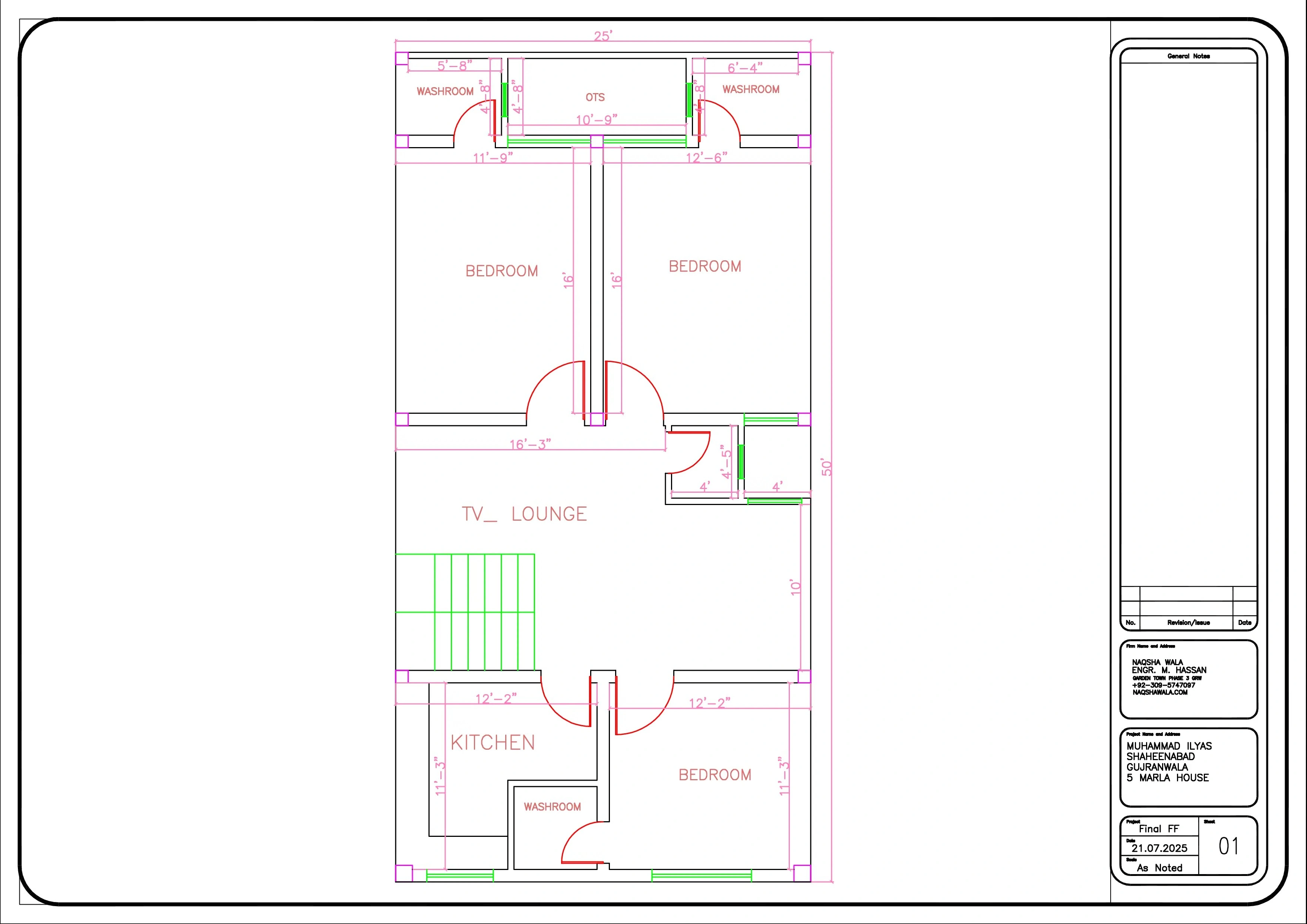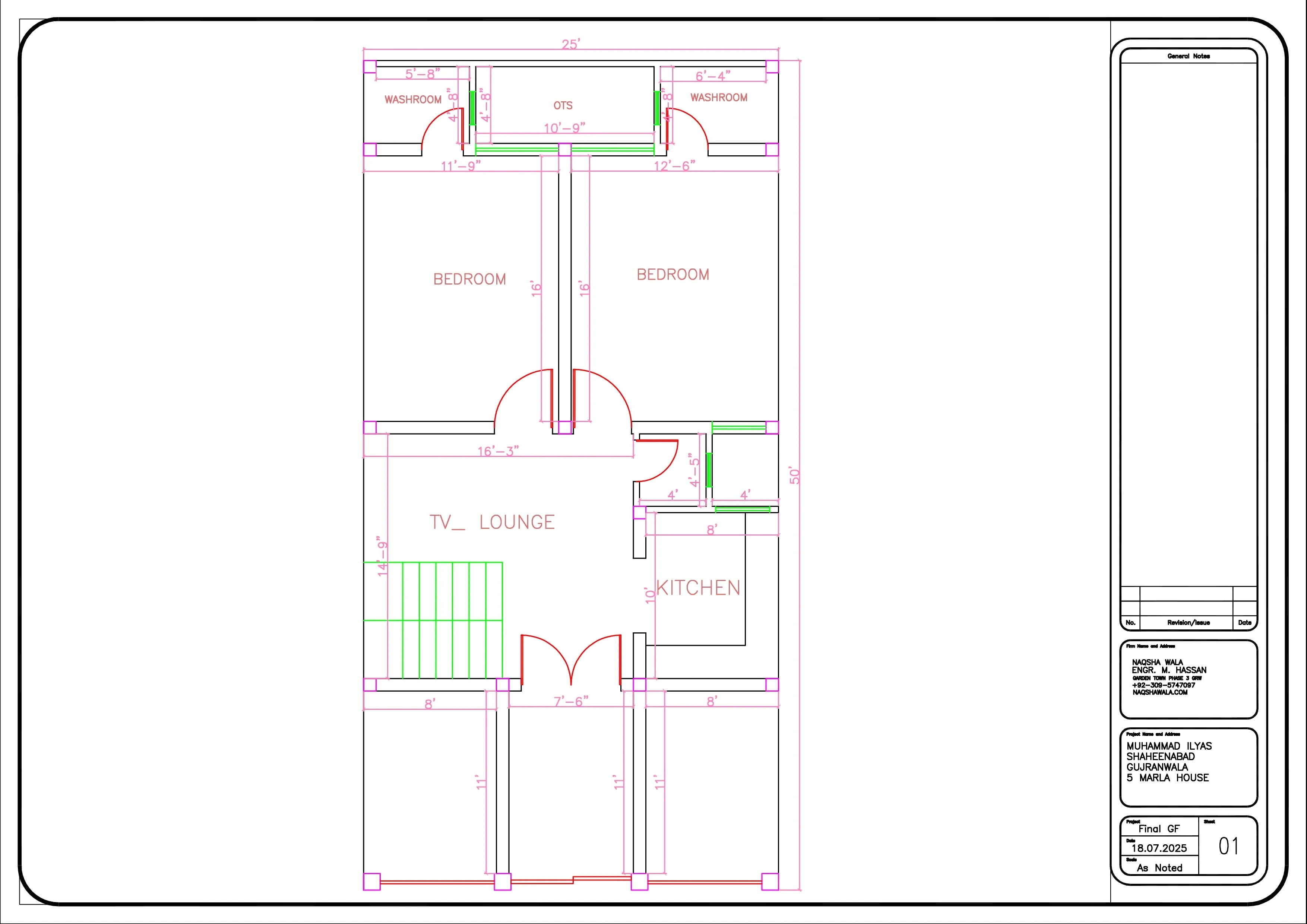 This project is a 5 Marla commercial-cum-residential house design in Shaheenabad, Gujranwala, owned by Ilyas. The plot is located on a fully commercial road, surrounded by shops and business activities, which made it essential to design a layout that could generate commercial value without compromising residential comfort. The client required two shops on the front side to utilize the commercial potential of the plot, along with a separate garage access leading towards the back residential portion of the house. Our Naksha Wala / Naqsha Wala team planned the project in a way that ensures smooth circulation, privacy, and functional zoning between commercial and residential areas. The residential layout includes a well-sized TV lounge, multiple bedrooms, kitchen, washrooms, staircase, and proper OTS ventilation, making the house comfortable for long-term living despite being in a busy market area. Along with floor plans, we also designed a modern commercial elevation that blends perfectly with the surrounding shops while maintaining a clean architectural identity. All drawings were prepared according to local building bylaws, successfully approved, and the construction of the house is now almost completed. This project stands as a strong example of smart naqsha planning for commercial roads in Gujranwala. Project Highlights 5 Marla commercial-cum-residential planning Two front-facing shops on commercial road Separate garage access to residential portion Ground Floor & First Floor detailed plans Proper ventilation with OTS Approval-ready drawings Modern commercial elevation design