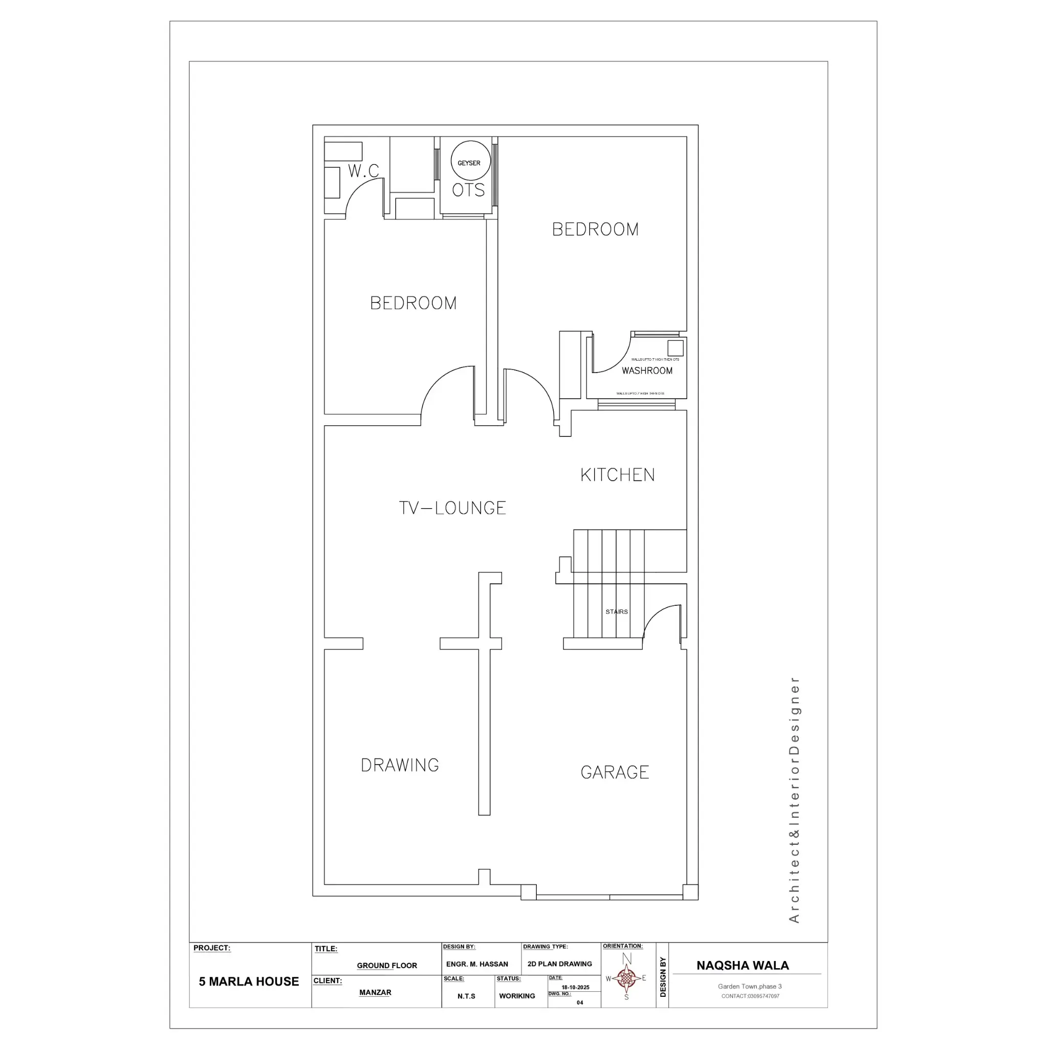 Project Description – 5 Marla House Design in Qila Didar Singh This project is a 5 marla residential house design created for our client Manzar in Qila Didar Singh. The plot size is 25 feet wide and 50 feet deep, which is one of the most common residential plot sizes in this area. Designing a house on a 25-foot-wide plot requires careful planning so that the house feels comfortable, open, and practical for daily living. At Naqsha Wala, our focus for this project was to provide a complete construction-ready solution, not just basic floor plans. The scope of work included architectural planning, MEP drawings, excavation and foundation details, staircase detailing, underground and overhead water tank planning, and a well-balanced front elevation design. Understanding the Plot & Client Requirements Qila Didar Singh has compact residential streets, so efficient space usage and proper ventilation are very important. The client wanted a house that is: Comfortable for family living Easy to construct Properly ventilated Future-proof with complete technical drawings Keeping these requirements in mind, the house was planned to separate guest areas, family areas, and private bedrooms while maintaining smooth circulation between spaces. Ground Floor Plan Explanation The ground floor is designed to provide both functionality and privacy. Garage & Entrance At the front of the house, a garage is provided for secure car parking. This helps protect the vehicle and keeps the street view clean. The entrance is planned in a way that visitors can enter the house without disturbing private family areas. Drawing Room A separate drawing room is located near the front. This space is ideal for guests and formal meetings. Having a separate drawing room is very important in Pakistani homes, as it maintains privacy for the family. TV Lounge (Family Living Area) The TV lounge is placed at the center of the house. It acts as the main family gathering space and connects different rooms naturally. The size of the lounge is kept practical so it can be used comfortably for sitting, watching TV, and daily family activities. Kitchen The kitchen is positioned close to the TV lounge for convenience. Its layout allows easy movement while cooking and serving food. Proper ventilation is provided so heat and cooking smells can escape easily. Bedrooms & Washroom Bedrooms on the ground floor are placed toward the rear side of the house to ensure peace and privacy. A washroom with an OTS (open-to-sky area) is provided. The OTS plays a very important role by bringing natural light and fresh air into the washroom and nearby spaces, reducing moisture and improving hygiene. First Floor Plan Explanation The first floor is designed mainly for private family use. Bedrooms Multiple bedrooms are planned on the first floor, each with proper proportions for furniture placement and comfortable movement. Windows are placed carefully to ensure natural light and ventilation. Study Area A dedicated study space is included, which can be used for reading, office work, or children’s studies. This area is quieter and separated from the main living spaces, making it ideal for focused activities. Staircase Placement The staircase is centrally located, making movement between floors easy and safe. Proper riser and tread dimensions were maintained to ensure comfort and safety for all age groups. Balcony A balcony is provided at the front side of the first floor. It improves ventilation, adds outdoor space, and enhances the overall appearance of the house from the street. MEP & Technical Drawings This project was not limited to architectural layouts only. We prepared complete MEP drawings, which are essential for smooth construction and future maintenance. Plumbing & Water System Underground water tank Overhead water tank Proper water supply lines Complete drainage and sewerage planning Electrical Planning Lighting layout Switch and socket positioning Power points for kitchen and appliances Structural & Construction Details Excavation layout Foundation details Column and beam coordination Staircase construction detailing All these drawings help contractors avoid mistakes on site and reduce extra construction costs.