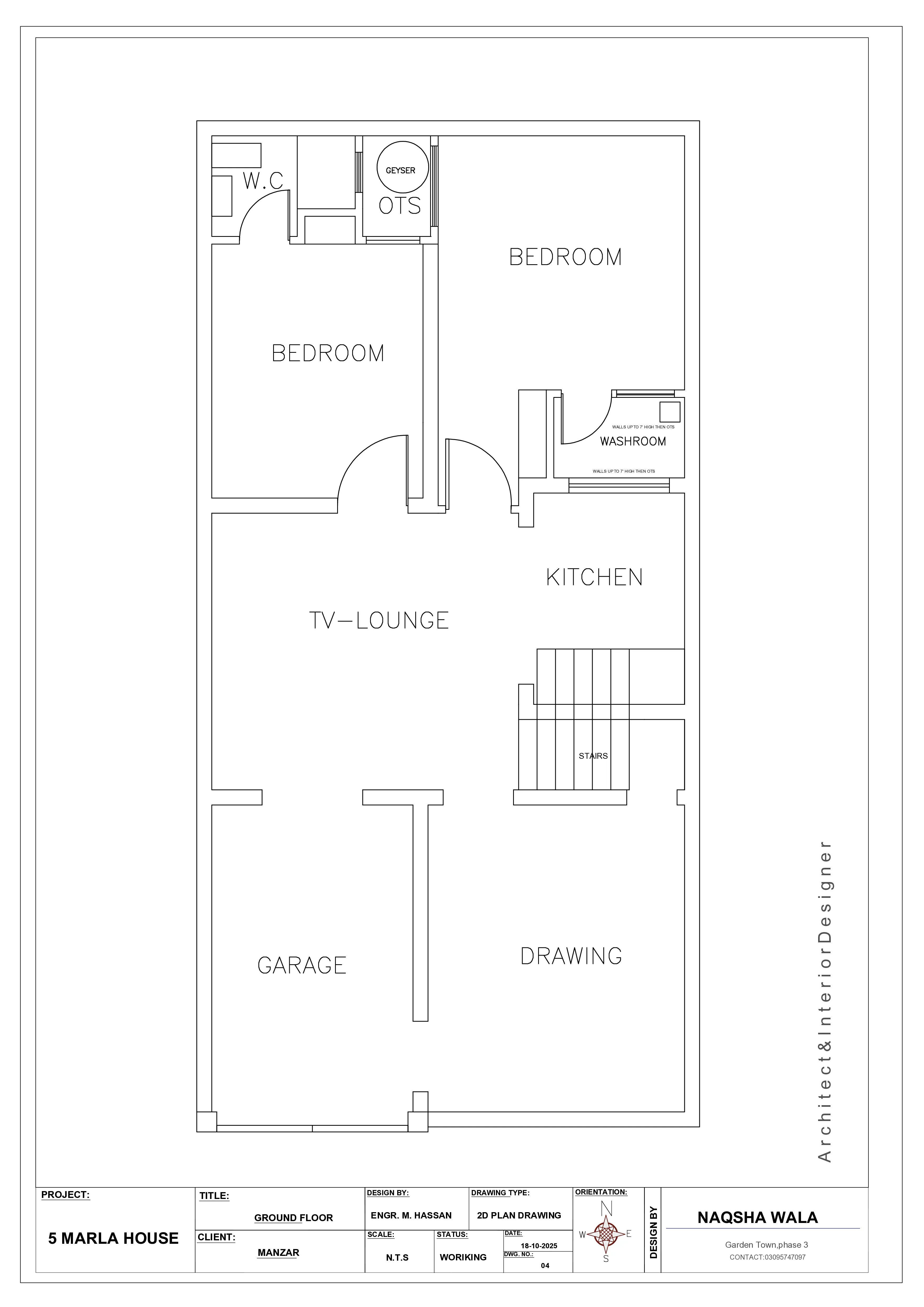 Designing a comfortable and functional house on a 5 Marla plot requires smart planning, experience, and creative thinking. This 5 Marla house plan (25 feet wide and 50 feet long) is a unique residential design developed by Naqsha Wala, specifically created to solve common space, lighting, and ventilation problems faced by homeowners in small plots. This project reflects modern architectural thinking while maintaining practicality for daily family life. This house plan is intentionally designed in a way that may seem different at first glance, but once understood, it clearly shows its strength in efficient space utilization and logical zoning. Every corner of the house is thoughtfully planned so that no space is wasted, making it an ideal solution for modern urban living. Smart Layout with Proper Zoning The ground floor layout begins with a properly designed garage, providing secure and convenient parking without disturbing the internal living spaces. Adjacent to the garage is the drawing room, which offers privacy for guests and formal meetings. This separation between public and private zones improves the overall functionality of the house. Moving further inside, the TV lounge acts as the central family area, connecting different parts of the house smoothly. The layout ensures easy movement while maintaining visual openness. This central placement also helps in improving airflow and daylight distribution throughout the house. Modern Open Kitchen Concept The house features a modern open kitchen, connected directly with the TV lounge. This open concept not only enhances the sense of space but also supports modern living where families prefer interactive and connected environments. The kitchen placement allows proper ventilation and natural light, making it comfortable for daily use. An additional smart feature of this plan is the efficient use of space beneath the staircase. Instead of leaving this area unused, it has been planned as a functional kitchen-support or storage area, ensuring maximum utilization of available space. Bedrooms with Attached Washrooms & Ventilation This 5 Marla house includes two well-sized bedrooms, each provided with properly attached washrooms. One of the major challenges in small house planning is managing washroom ventilation and natural lighting. In this design, these issues are effectively resolved through strategic placement of washrooms and open-to-sky areas. The use of open-to-sky (OTS) spaces ensures fresh air circulation and natural light, eliminating dampness and improving hygiene. This thoughtful planning significantly enhances indoor comfort and long-term livability. Focus on Light & Cross Ventilation A key strength of this house plan is its excellent cross ventilation system. Openings are placed carefully to allow air to flow naturally through the house, reducing reliance on artificial cooling. Natural light is introduced into living areas, bedrooms, and washrooms, creating a bright and healthy indoor environment. This focus on ventilation and daylight makes the house energy-efficient and suitable for local climatic conditions. Additional Functional Features A dedicated drying area has been provided to support daily household needs, a feature often ignored in small residential designs. This area helps keep the rest of the house organized and clutter-free. The internal staircase is designed with safety and accessibility in mind, ensuring smooth vertical movement to future floors. Its position does not disrupt the main living spaces, maintaining both privacy and functionality. Project Details This house plan was designed for Mr. Manzar and is located in Qila Didar Singh. The design reflects local living requirements while maintaining modern architectural standards. It is ideal for families looking for a balanced combination of aesthetics, comfort, and smart planning within a limited plot size. Why Choose Naqsha Wala? This project highlights how Naqsha Wala specializes in creating intelligent house plans that solve real residential challenges. Through experience, creativity, and attention to detail, Naqsha Wala delivers designs that are practical, modern, and future-ready. This 5 Marla house plan is a perfect example of how good design can transform limited space into a comfortable and stylish home.