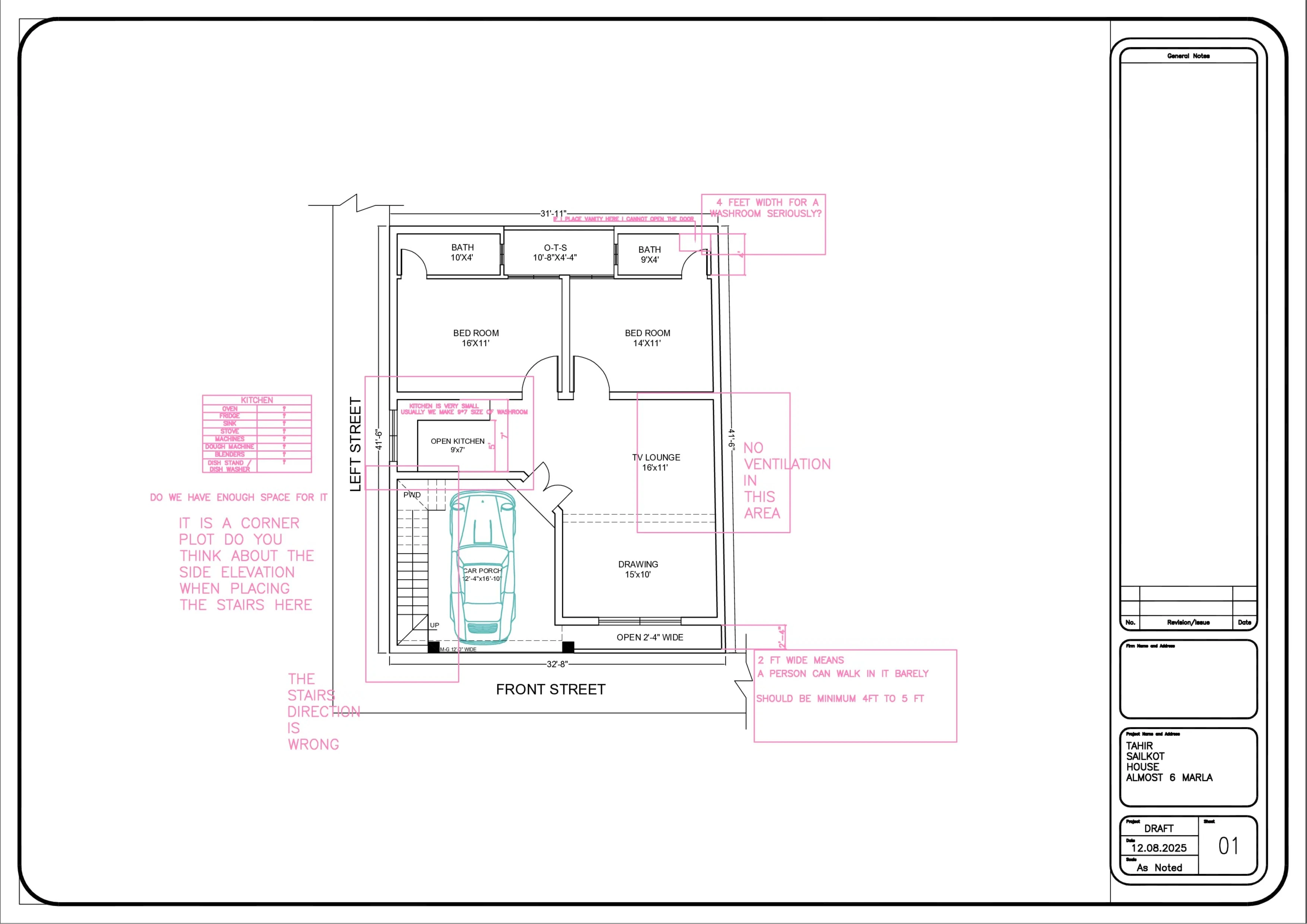 At Naqshawala Islamabad, we provide professional house plan redline, rechecking, and architectural supervision services for homeowners who are not satisfied with their existing drawings. This project involved a 5 marla house plan in Islamabad that was originally designed elsewhere, but the client felt the layout was uncomfortable and poorly planned. After reviewing the drawings in detail, our architects identified several major planning mistakes. The front yard space was extremely small, making it unusable for movement or practical use. The kitchen size was inadequate, limiting functionality and workflow, while the washrooms were undersized and poorly proportioned. In addition, the plan lacked proper ventilation, which would have resulted in dark interiors, poor airflow, and long-term comfort issues. Instead of a full redesign, the client requested redlining and supervision, a service where Naqshawala Islamabad carefully reviews the plan, marks corrections, and guides improvements before construction begins. Our focus was to enhance space usability, ventilation, and compliance with standard 5 marla planning principles, while keeping the original structure intact. This project highlights the importance of architectural supervision and plan verification. Many house plans look fine on paper but fail in real life due to poor proportions and circulation. With professional rechecking, homeowners can avoid costly mistakes, future renovations, and construction delays. If you already have a house plan and want expert feedback before construction, Naqshawala Islamabad offers reliable, practical, and cost-effective plan supervision services across Islamabad.