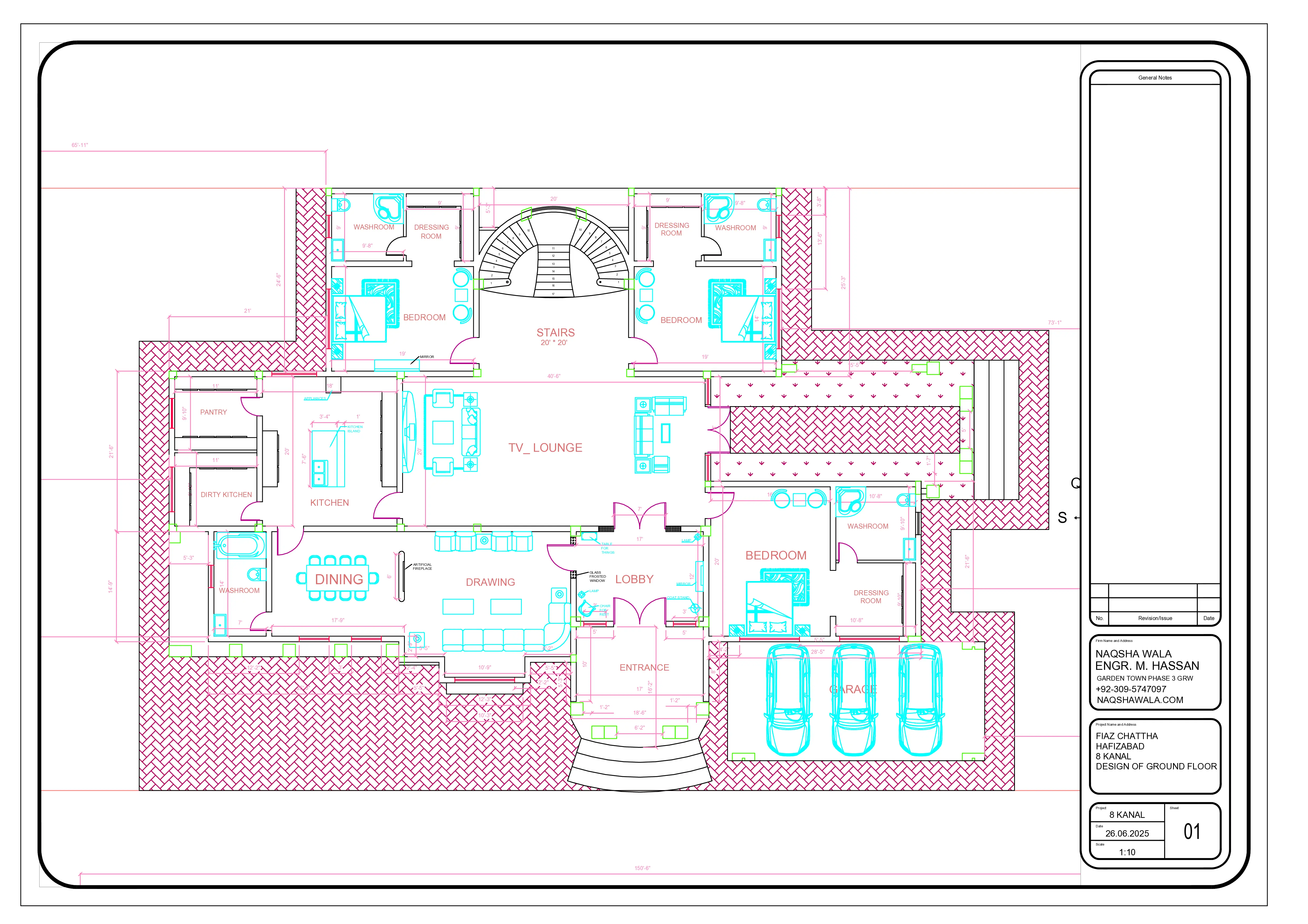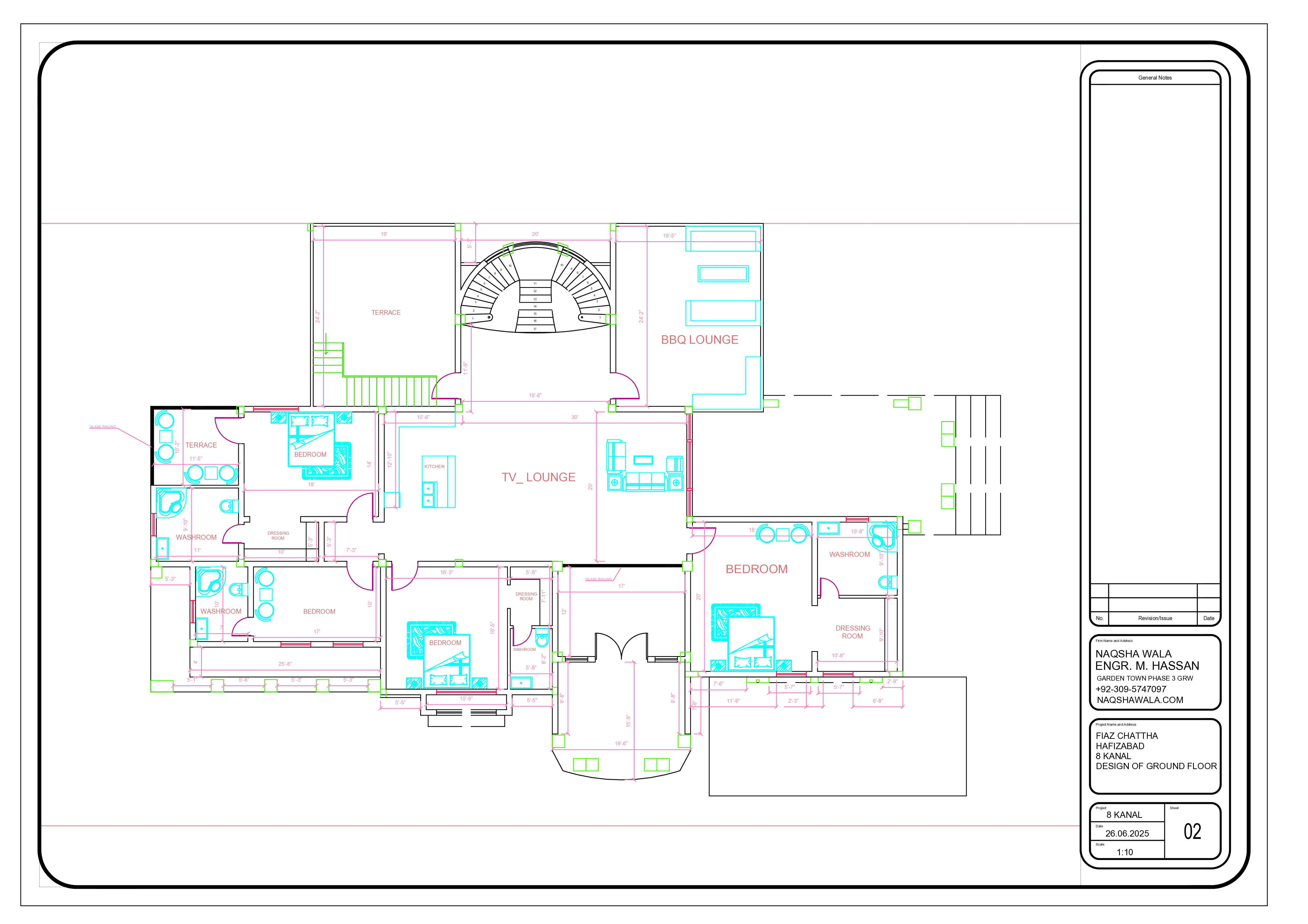 Designing an 8-kanal luxury residence (almost one acre) is not just about drawing walls and rooms — it is about creating a lifestyle, circulation, hierarchy of spaces, and architectural balance. This project, located in Bhiri Chatha / Alipur Chatha near Gujranwala, stands out as one of the most detailed and thoughtfully planned houses I have ever designed. The client contacted us through our website with a clear vision: they wanted their own canal-style house, something grand, elegant, and future-proof — not a copy-paste design. Client Brief & Design Philosophy Initially, the client mentioned a “canal house,” but after detailed discussions, the actual requirement turned into a full 8-kanal residential mansion. Their key demands were: Large, luxurious bedrooms A grand double-height entrance Multiple lounges for formal and family use Proper separation of guest and private zones Spacious kitchen with dirty kitchen support Elegant circulation without wasted space From day one, the goal was planning efficiency with luxury, not just scale. Ground Floor Planning Concept (As Seen in the Drawing) The ground floor plan is designed to create a strong first impression while maintaining privacy and comfort. 1. Grand Entrance & Lobby A double-height entrance foyer welcomes residents and guests Visually connected to the main lobby for openness Acts as a central transition between public and private spaces This kind of entrance is rarely planned correctly, but here it becomes a statement feature of the house. 2. Formal Drawing Room Positioned near the entrance for guest access Designed for large gatherings Maintains privacy from the rest of the house The drawing room placement ensures guests never disturb family living zones, which is critical in large homes. 3. Central TV Lounge (Heart of the House) Located at the center of the plan Acts as a connector between all major spaces Balanced proportions for furniture and movement This TV lounge becomes the daily living hub, surrounded by bedrooms, dining, and stairs. 4. Bedroom Planning (Luxury & Comfort) The ground floor includes multiple large bedrooms, each planned with: Attached washrooms Separate dressing rooms Proper furniture circulation Natural ventilation Each bedroom is designed as a private suite, not just a sleeping space. 5. Kitchen, Dirty Kitchen & Pantry Main kitchen connected to dining Separate dirty kitchen for heavy cooking Pantry space for organized storage This setup ensures cleanliness, functionality, and long-term usability, especially in large families. 6. Dining Area Directly connected to the kitchen Proper spacing for large dining tables Comfortable circulation for events and family dinners 7. Staircase Design (Architectural Feature) Centrally placed staircase Wide, curved layout Easy access from lounge The staircase is not hidden — it is designed as a visual architectural element. 8. Garage & Service Areas Large garage accommodating multiple cars Separate access flow for vehicles Clean integration with main building mass Planning Strengths of This 8-Kanal House ✔ Clear zoning (public, semi-private, private) ✔ No wasted corridors ✔ Balanced symmetry ✔ Ideal for luxury living ✔ Future expansion friendly This is not a typical farmhouse plan — it is a professionally structured mansion layout. Why This Project Is Special What makes this project truly unique is not just the size, but the value delivered: Market design quotes: 5–10 lakh PKR Our complete design execution: around 3 lakh PKR Delivered with professional drawings & planning expertise The client was genuinely surprised by the quality-to-cost ratio, which ultimately led to full design execution. Today, the house is near completion, based entirely on these drawings. Location Advantage This project is located near Bhiri Chatha and Alipur Chatha, areas known for: Open land availability Farmhouse-style living FutureAttach it with images (like the one you shared) and this post will rank extremely well for searches like: 8 kanal house plan in Gujranwala Luxury farmhouse plan Punjab Architect in Bhiri Chatha 8-kanal luxury house planning + Gujranwala local SEO: 8-kanal-house-plan 1-acre-house-design luxury-house-plan-gujranwala farmhouse-house-plan-punjab canal-house-design-pakistan bhiri-chatha-house-design alipur-chatha-house-plan gujranwala-architect luxury-home-planning-pakistan large-house-floor-plan spanish-style-house-plan double-height-entrance-house modern-house-plan-punjab