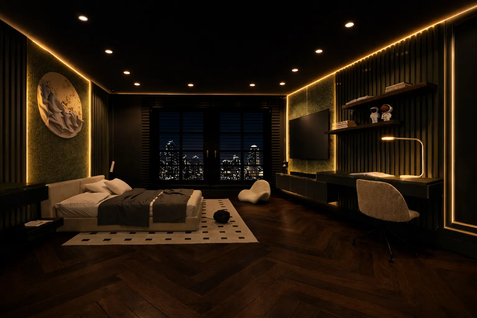 Designing a bedroom is not just about placing a bed and a cupboard inside a room. A well-designed bedroom reflects personality, lifestyle, comfort, and future planning. This project was a special one for us because it was designed for my cousin Ibrahim Zainjua, who lives in Bahria Town Phase 8, Block E. Ibrahim wanted to renovate his bedroom and transform it into a modern, comfortable, and stylish personal space that also supports his gaming lifestyle. As the architect and designer behind Naqsha Wala, I was given the responsibility to design a room that is both visually appealing and highly functional. Ibrahim specifically requested a bedroom that includes a 65-inch display TV, a dedicated gaming setup, a modern bed area, and a dressing space with cupboards planned for the future when he gets married. The goal was to create a room that serves his present lifestyle while also preparing the space for future needs. This bedroom design project in Bahria Town Phase 8 Rawalpindi focuses on modern interior design principles including lighting design, texture contrast, color harmony, and functional layout planning. Every element of the room was carefully designed to create a luxurious yet comfortable environment. Concept and Design Approach The main concept behind this bedroom design was modern luxury with warm and moody lighting. We wanted the room to feel cozy during nighttime while still maintaining a stylish architectural character. To achieve this, we used dark tones combined with warm lighting and wooden textures. The flooring plays a very important role in defining the character of the room. For this project, we designed a rich herringbone wooden flooring pattern. This flooring style instantly elevates the interior and adds depth and elegance to the space. The dark wooden tone also complements the green textured walls and black design elements used in the room. The walls were designed using textured panels and vertical groove elements. These features help break the monotony of flat walls and introduce a premium architectural feel. The textured wall behind the bed and TV creates a focal point that enhances the overall visual appeal. Bed Wall Design The bed wall was designed as the main focal point of the bedroom. Instead of using a simple plain wall, we created a feature wall with texture and artistic elements. The bed is placed on a soft neutral rug that balances the darker tones used in the rest of the room. To further enhance the bed wall, we added profile LED lighting that runs along the edges of the design panels. This warm lighting highlights the textures and creates a relaxing nighttime atmosphere. The lighting is subtle but powerful enough to define the architectural lines of the wall. A sculptural wall artwork was added above the bed to bring an artistic touch to the space. This element helps break the symmetry of the wall while still maintaining balance within the design. TV Wall Design The TV wall design was one of the most important parts of this project because Ibrahim requested a 65-inch display screen for both entertainment and gaming. The TV was mounted on a feature panel wall designed with textured green surfaces and vertical grooves. Beneath the TV, we designed a floating media console that provides storage while keeping the design clean and minimal. To add depth and drama to the TV wall, profile lighting was integrated around the panel edges. This lighting creates a glowing frame around the TV wall and enhances the viewing experience during nighttime. Floating shelves were added next to the TV area for decorative objects and accessories. These shelves add personality to the space while maintaining the modern design theme. Gaming Setup Since Ibrahim is passionate about gaming, we designed a dedicated gaming and workstation setup within the bedroom. The gaming desk is positioned on the side of the TV wall so that the display can also be used for gaming when needed. The desk was designed as a floating workstation with a sleek surface and integrated lighting. A modern chair complements the workstation area, making it both functional and aesthetically pleasing. The desk area also includes shelves and lighting elements that highlight gaming accessories, collectibles, and books. Ceiling Design The ceiling design was kept modern and minimal while still maintaining elegance. Instead of complex false ceiling patterns, we used a linear panel ceiling with recessed spotlights. For the nighttime render concept, the ceiling was finished in matte black, which helps hide shadows and creates a cinematic lighting environment. The warm recessed lights illuminate the room evenly while keeping the focus on the architectural elements of the walls. This approach also enhances the gaming atmosphere because darker ceilings reduce glare and make screen viewing more comfortable. Lighting Design Lighting plays a critical role in modern interior design. In this bedroom project, we used a combination of lighting techniques: • Warm recessed ceiling lights • Profile LED strip lighting • Task lighting for the desk area • Ambient lighting behind feature panels This layered lighting approach ensures that the room looks beautiful both during the day and at night. Future Dressing Area and Cupboards Another important requirement of the project was planning for future storage and dressing space. Since Ibrahim will eventually need more wardrobe space after marriage, we designed a dedicated wall area that can accommodate large wardrobes and dressing units in the future. The cupboards were planned in a way that they integrate seamlessly with the existing design theme. This ensures that future additions will not disturb the visual harmony of the room. Final Result The final bedroom design successfully combines modern luxury, gaming functionality, and future planning. The combination of textured walls, warm lighting, wooden flooring, and minimal furniture creates a space that feels both elegant and comforta