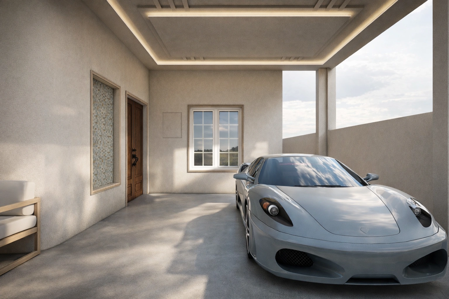 This project showcases a modern residential garage design in G-9 Islamabad, thoughtfully planned to combine functionality, durability, and refined architectural aesthetics. Instead of treating the garage as a basic parking space, the design transforms it into a clean, well-finished area that complements the overall quality and style of the house. The garage walls are finished with a soft off-white rock wall texture, giving the space a bright, elegant, and durable appearance. This textured wall finish enhances visual depth while remaining practical for daily use. The off-white tone reflects light effectively, helping the garage feel open and spacious even during low-light conditions. A standout feature of this garage design is the incorporation of decorative wall niches finished with mosaic tiles. These mosaic-lined niches add character and artistic detail to the walls, breaking the monotony of plain surfaces. The mosaic texture introduces subtle contrast and craftsmanship, making the garage visually appealing without compromising its clean and minimal look. The false ceiling design plays a key role in elevating the garage interior. A modern false ceiling is installed with concealed LED strip lighting, providing soft and evenly distributed illumination. This indirect lighting enhances visibility while creating a premium architectural feel. The ceiling design ensures the garage remains well-lit, comfortable, and visually refined throughout the day and night. The flooring is designed for durability and ease of maintenance, suitable for daily vehicle movement while maintaining a neat appearance. Its neutral tone complements the off-white walls and ceiling, contributing to a cohesive and uncluttered interior look. Natural light and ventilation are introduced through white aluminium windows, which add both functionality and a modern touch. Aluminium frames are chosen for their strength, low maintenance, and resistance to weather conditions. The white finish blends seamlessly with the wall color, maintaining visual harmony while allowing daylight to enter the space. The garage layout is planned to provide comfortable car parking with proper circulation space. The proportions allow smooth vehicle movement, easy entry and exit, and adequate clearance around the car. This thoughtful planning ensures the garage remains practical while feeling spacious and organized. From an architectural perspective, this garage design reflects a modern residential approach in Islamabad, where attention to detail extends to every part of the home. The combination of rock wall texture, mosaic niches, aluminium windows, and false ceiling lighting demonstrates how utility spaces can be both functional and aesthetically pleasing. This garage design is ideal for homeowners in G-9 Islamabad who want a stylish, durable, and well-planned garage that enhances the overall value of their property. The clean finishes and thoughtful detailing ensure long-term usability with a premium look. If you are looking for a professional architect or interior designer in Islamabad for garage design, false ceiling work, wall finishes, mosaic detailing, or complete residential projects, this project is a strong example of quality design and execution. Overall, this garage interior is designed to feel clean, modern, and refined, proving that even parking spaces can be elevated through professional architectural planning.