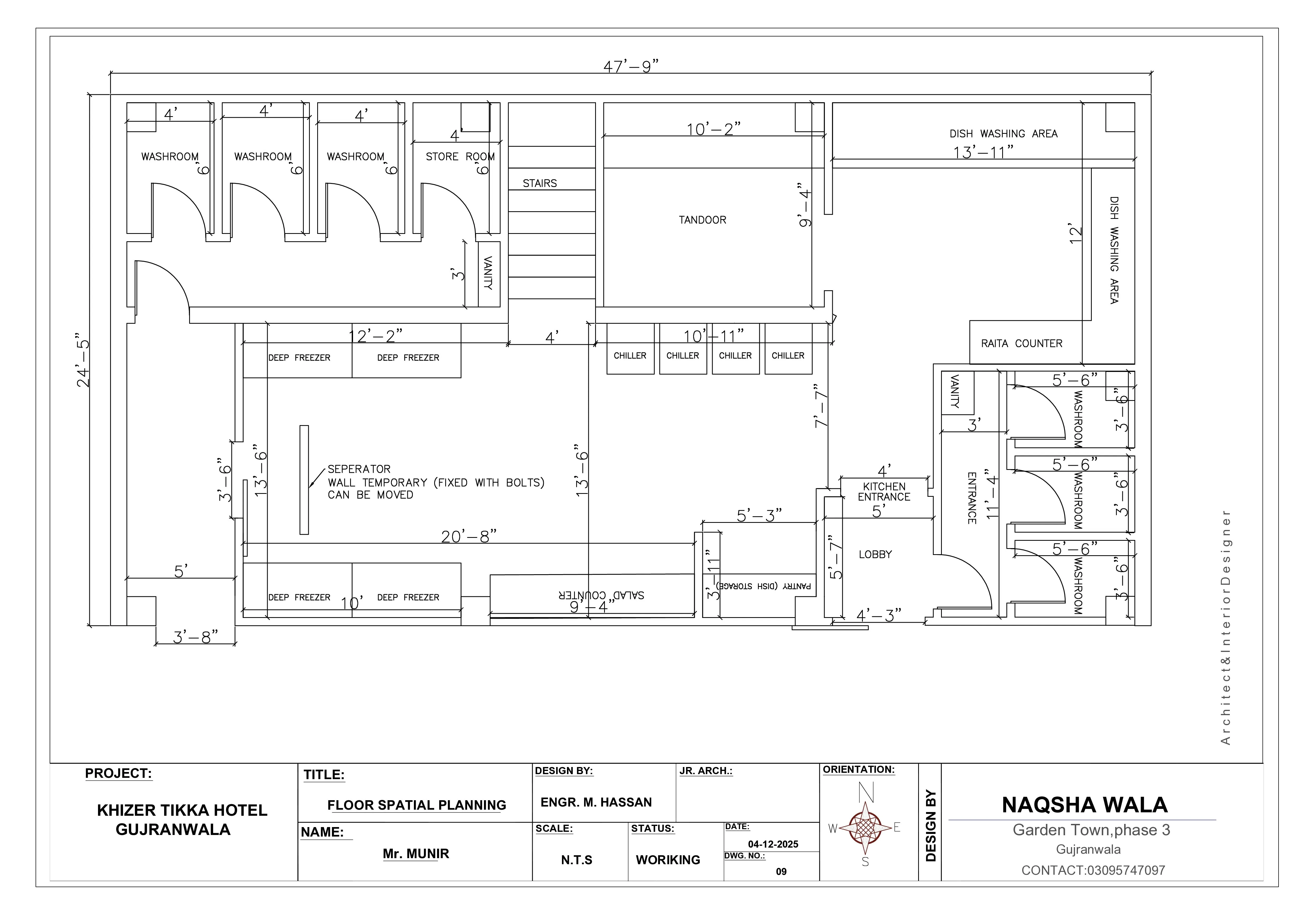 This project is a complete interior renovation of a commercial food lounge / physical café setup, where the client wanted to redesign their main ground-level branch to improve functionality, hygiene, privacy, and overall customer experience. The existing interior layout was outdated, inefficient, and not suitable for a growing business with multiple investors involved. One of the biggest issues in the old layout was the poorly designed kitchen and washroom areas. The kitchen lacked proper zoning, there was no defined washing area, and food preparation activities were overlapping with customer circulation. Additionally, there was no separate washroom for ladies, which is a major requirement for modern commercial spaces and a critical factor for customer comfort. At Naqshawala, we started this renovation by completely stripping the existing layout and rethinking the space from scratch. The goal was not just renovation, but professional space planning that supports smooth operations, investor confidence, and long-term scalability. A major requirement from the client was to create a proper back kitchen and washing area, completely hidden from customers. They clearly wanted that customers sitting in the dining or lounge area should not see or interact with kitchen staff, washing activities, or preparation zones. This separation was achieved by designing a back-of-house layout, ensuring privacy, cleanliness, and a premium customer-facing environment. The kitchen was redesigned with clear zoning: Dedicated cooking area Separate washing and cleaning zone Proper pantry and storage area A specialized salad preparation section, isolated from hot kitchen operations for hygiene and efficiency This salad and pantry area was specifically requested by the client to improve food quality and speed of service, especially during rush hours. Such zoning is essential in modern food businesses and also helps in meeting health and safety standards. Another important aspect of this project was washroom planning. We introduced separate washrooms for ladies and gents, designed in a way that they are accessible but discreet, maintaining privacy while being easy to locate. Proper ventilation, circulation, and material selection were also considered to ensure durability and cleanliness. Since the business involves around 8 investors, the design also needed to look professional, scalable, and financially sensible. The renovation plan was created in a way that improves workflow, reduces staff movement conflicts, and increases operational efficiency — all of which directly impact profitability and investor satisfaction. The final renovation plan transformed the space into a fully functional commercial interior, suitable for smooth daily operations, better customer experience, and future business growth. From circulation planning to service separation, everything was designed to meet real operational needs rather than just visual appeal. This project clearly reflects Naqshawala’s approach to commercial renovation — not just changing finishes, but redesigning how a space works. Whether it’s a café, food lounge, restaurant, or commercial kitchen, we focus on planning that supports business success, hygiene standards, and customer comfort. This renovation proves that with the right naksha, naqsha planning, and professional renovation strategy, even an inefficient commercial space can be converted into a modern, profitable, and investor-ready business environment.
