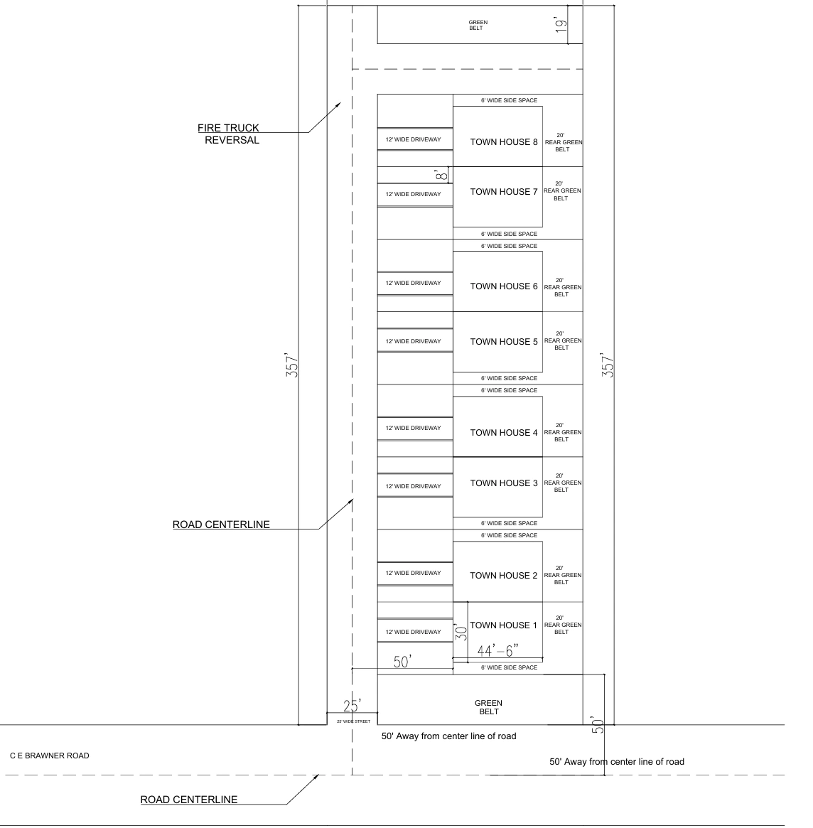 This project represents a complete and professionally engineered townhouse land subdivision located on CE Brawner Road, Arkansas 72396, where we delivered a fully compliant site plan, plot cutting, and development layout according to the county planning, fire safety, zoning, and setback regulations of this region. The goal of this development was to transform a large parcel of land into a functional, safe, legally approvable townhouse community, ensuring every square foot met regulatory, engineering, and planning standards required for township and county approval. The layout consists of eight townhouses arranged in a linear development block, with each unit carefully positioned to comply with minimum setbacks, driveway widths, emergency access, green belt buffers, and lot dimensions. The design ensures that every townhouse benefits from both front access and rear green belt space, increasing livability, ventilation, drainage, and environmental compliance. A continuous 20-foot rear green belt was provided behind each townhouse, serving multiple purposes including stormwater absorption, landscape buffer, fire safety clearance, and zoning compliance. One of the most critical elements of this project was the design of the roadway system and fire-truck reversal zone. The road network was laid out with a clearly marked centerline, proper lane widths, and a dedicated fire-truck turning and reversing area so emergency vehicles can enter, maneuver, and exit safely in compliance with Arkansas fire code and subdivision regulations. This is especially important for multi-unit residential developments where emergency access must be guaranteed for approval. Each townhouse is served by a 12-foot wide private driveway, ensuring that vehicles can access garages or parking spaces without blocking the internal circulation road. Between units, 6-foot wide side spaces were introduced, creating fire separation, service access, and visual openness. These side spaces also help reduce fire spread risk and provide maintenance corridors as required by county planning rules. The project also incorporates 50-foot setbacks from the road centerline, as shown in the drawing, complying with CE Brawner Road zoning and right-of-way regulations. This setback ensures that the development does not encroach on future road expansion zones and maintains legal front clearance, which is essential for planning approval and building permits. From an environmental and engineering standpoint, the development includes a carefully designed green belt system at both the front and rear of the site. These landscaped buffers are not decorative only — they are critical for stormwater control, pervious surface compliance, and environmental impact mitigation. When submitting subdivision plans in Arkansas counties, developers must demonstrate the percentage of pervious versus impervious surfaces, and this project was designed to pass those calculations efficiently. The site plan also identifies all impervious areas such as: Driveways Building footprints Internal access roads and all pervious areas such as: Green belts Side yards Rear buffer zones These calculations are essential for stormwater management approval and drainage compliance. This allows the county to verify that runoff will not overload municipal systems or flood neighboring properties. The lot cutting for each townhouse was executed with equal spacing, legal access, and zoning-compliant dimensions, ensuring that each unit can be sold, financed, and permitted independently. This is extremely important for real estate developers who plan to sell or mortgage individual townhouses after construction. This development plan was prepared to be submitted directly to county offices, planning departments, fire authorities, and building control agencies. It includes all required elements: Road centerlines Fire-truck access and reversal Setbacks Green belts Driveway widths Unit spacing Lot depths Development length and width Right-of-way offsets The project at CE Brawner Rd, Arkansas 72396 demonstrates how professional site planning, land cutting, and subdivision engineering can transform raw land into a fully compliant residential community ready for approval and construction. Whether you are a real estate investor, builder, or landowner, this kind of planning is what allows your project to move from concept to legally buildable development. Our approach ensures zero approval risk, maximum land utilization, and long-term property value, making this townhouse subdivision a perfect example of professional land development done right.