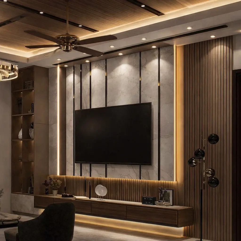 This project focuses on designing a modern luxury TV board that acts as the main visual anchor of the living space. The client hired us specifically to design a TV board and TV wall feature that feels premium, architect-designed, and timeless—something that immediately elevates the entire room. The TV wall is composed of vertical fluted panels, combined with a large central marble-textured panel that frames the TV perfectly. These vertical grooves are not just decorative; they create rhythm, height, and depth, making the wall appear taller and more refined. Slim black metal inlays run vertically between the panels, adding contrast and a contemporary architectural touch. One of the strongest elements of this TV board design is the warm ambient LED lighting. Hidden cove lights around the ceiling and backlighting behind the panels create a soft glow that enhances textures without overpowering the space. The lighting is carefully balanced to ensure a cozy atmosphere while also highlighting the TV wall as a feature element. Below the TV, a floating media console was designed with clean lines and a minimal profile. This keeps the floor visually open and gives the TV wall a light, modern appearance. The console provides practical storage while maintaining a clutter-free look, which is essential for luxury interiors. The material palette—neutral tones, warm wood textures, matte finishes, and soft lighting—was selected to ensure longevity and elegance. This TV board design reflects how good architectural detailing can turn a simple wall into a statement feature without excessive ornamentation. This project clearly demonstrates our approach to custom TV board design, where aesthetics, functionality, lighting, and proportions come together to create a refined living space. It’s an ideal reference for clients looking for a modern TV wall design in Pakistan that feels professionally planned and architect-approved.
